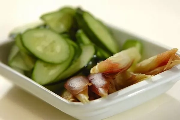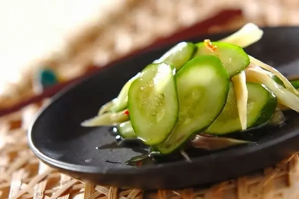 1、キュウリは端を切り落として、厚さ3mmの斜め薄切りにする。ミョウガは縦4等分に切る。