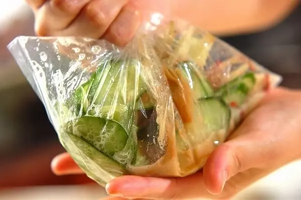 2、抗菌袋に<漬けダレ>の材料を入れ、(1)を入れてもみ込む。全体が漬かるように時々もみ込んで、冷蔵庫に一晩置く。