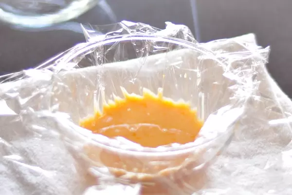 1、耐熱容器にラップをしき、卵を割り入れる。