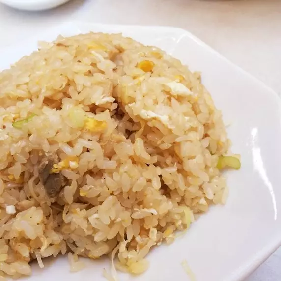 【みつさんの解説】具はチャーシュー、卵、ネギ。これまた見た目の想像、期待したどおりの炒飯。若干固めの炊きあがりのご飯をしっとり仕上げの炒飯。味も風味もしっかりしている。