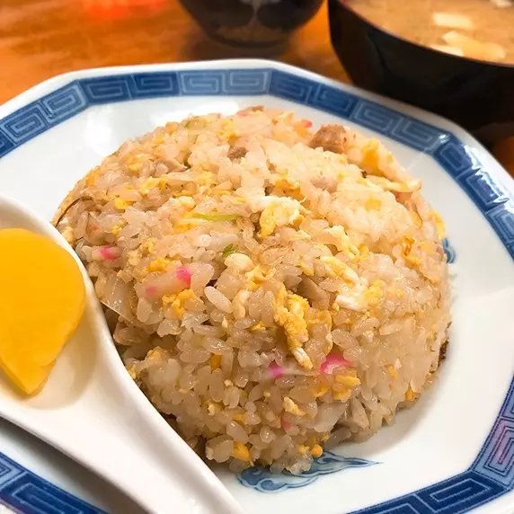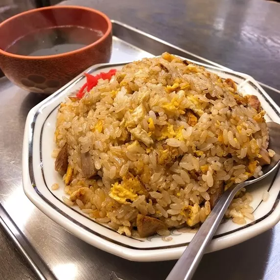 【みつさんの解説】「炒める」というよりは「焼く」ことに意識されているような炒飯。具材は、卵、チャーシュー、紅生姜。また横に添えてある紅生姜。混ぜるとこってりめの炒飯がさっぱりとする味変がいい。