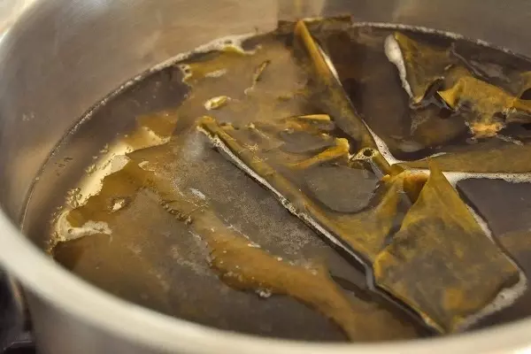 2、鍋に<スープ>の材料を入れて強めの中火で熱し、煮たつ直前に昆布を取り出して弱火にする。