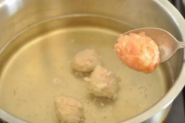 3、(1)をスプーンですくってまとめ、(2)に静かに入れる。煮たったらアクを取り、15分煮る。
