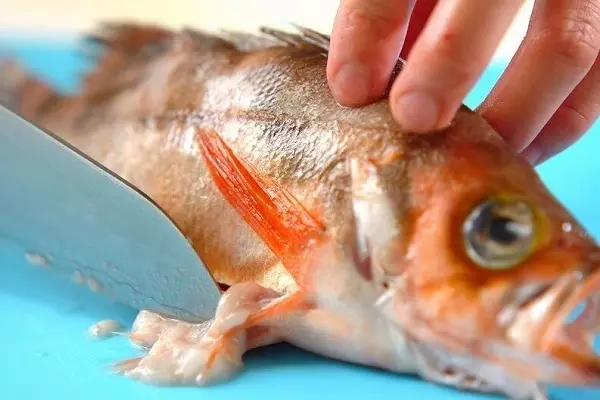 ・メバルはウロコをこそぎ、エラぶたを開けてエラを取り除く。裏側の腹に切り込みを入れてワタを取り出し、中を水洗いする。身の厚い部分(両面)に切り込みを入れる。