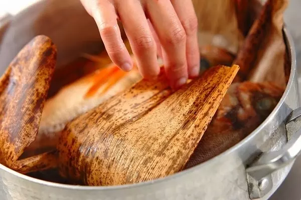 2、再び煮たったら中火にし、4~5分煮て時々だし汁を全体にかけ、メバルの表面をかためる。竹皮をメバルを包むように折り曲げ、落とし蓋をして15分煮る。
