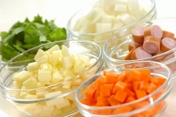・セロリは筋を引き、1cm角に切る。セロリの葉の部分は、粗みじんにする。ニンジンと大根は皮をむき、1cm角に切る。ソーセージは幅1cmに切る。