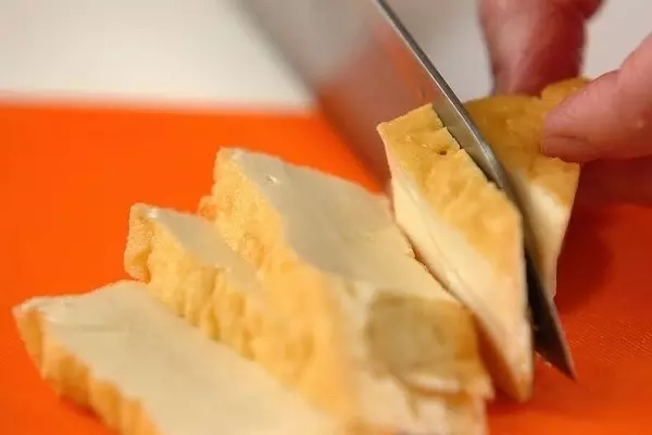 1、厚揚げを1cm幅にスライスする。ピーマンは食べやすい大きさに切り、白ネギは厚さ2~3cmの斜め切りにする。