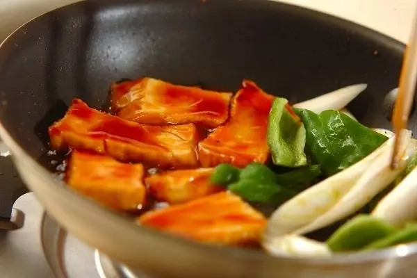 3、フライパンにゴマ油を入れ、(2)とピーマン、白ネギを並べ、ひっくり返しながら焦がさないように焼く。