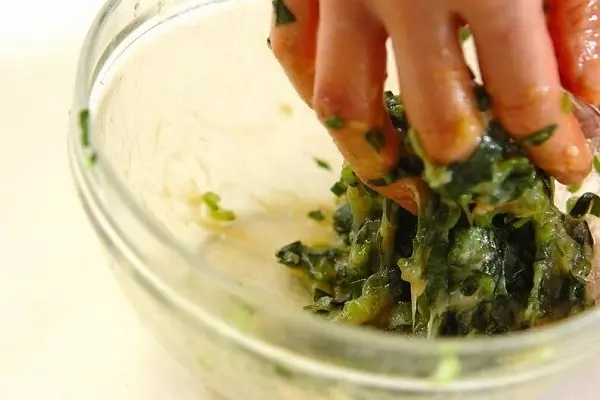 1、小松菜は根元を切り落としてきれいに水洗いし、細かく刻んで塩少々でよくもみ、水気を絞る。<タネ>の材料をボウルに入れ、粘りが出るまで手でよくこねる。ワンタンの皮に水をつけながら包み込む。