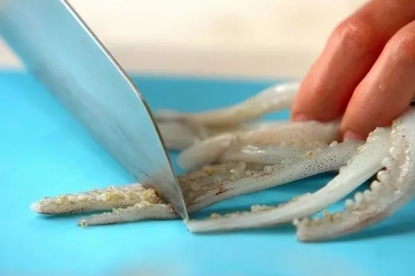 ・足は目の際で切り落としてくちばしを取り、足先を切り揃える。吸盤は包丁でこそげ落とし、2本ずつに切り分ける。