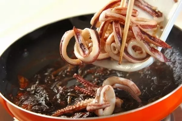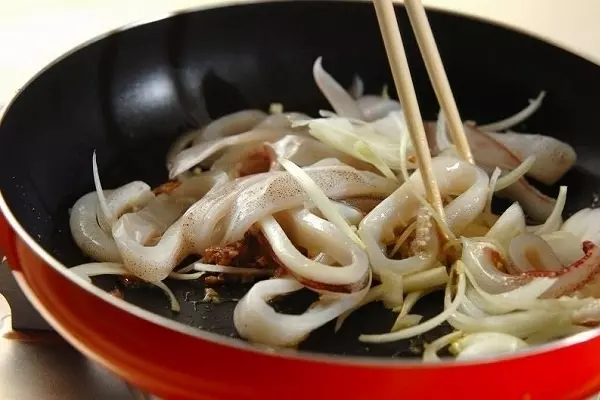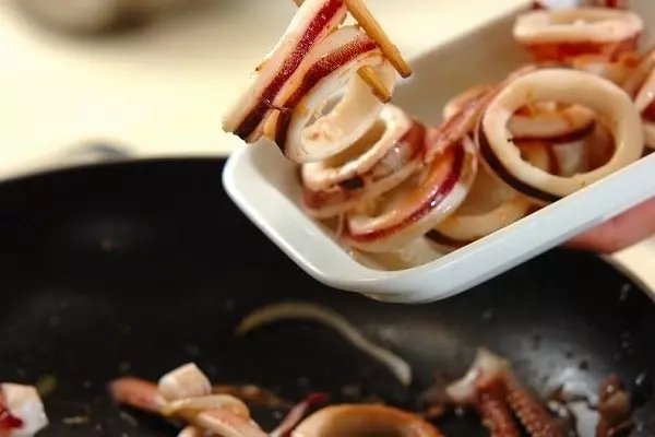 3、(1)が全体に炒められたら、いったんイカを取り出しておく。