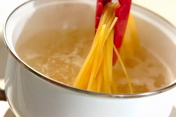 2、たっぷりの熱湯に塩を入れ、スパゲティーを指定時間より1分短めにゆで、ザルに上げる。