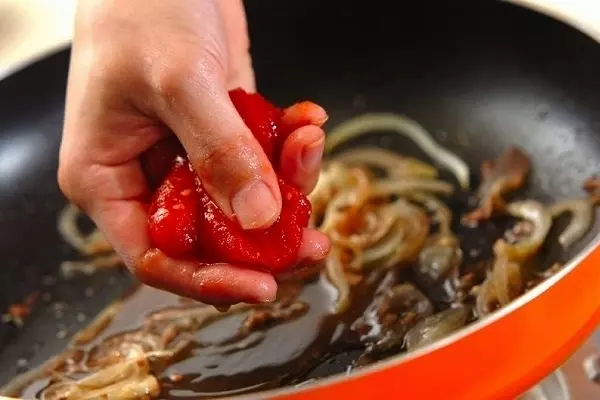 水煮トマトがホールの場合は、手でつぶしながら加えて下さい。