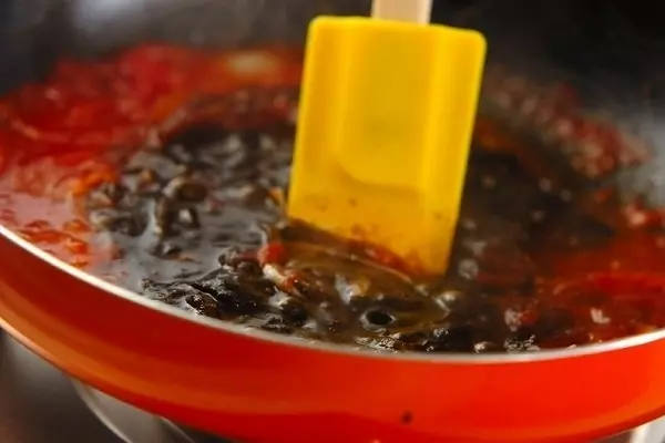 5、イカスミペーストを白ワインと混ぜ合わせて加え、さらに弱火にかけておく。