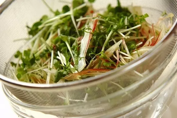 1、ミョウガ、貝われ菜、大葉を水に5~10分さらし、ザルに上げて水気をよくきり、皿に盛る。