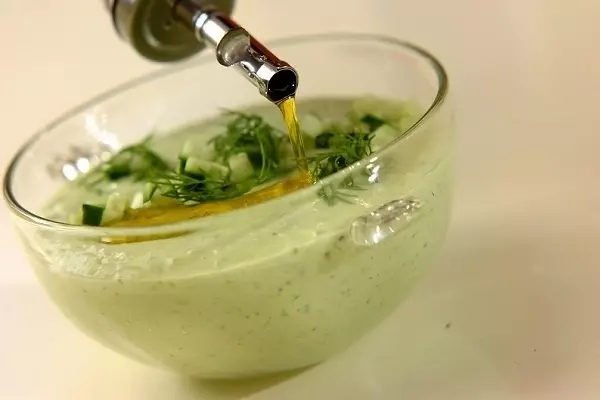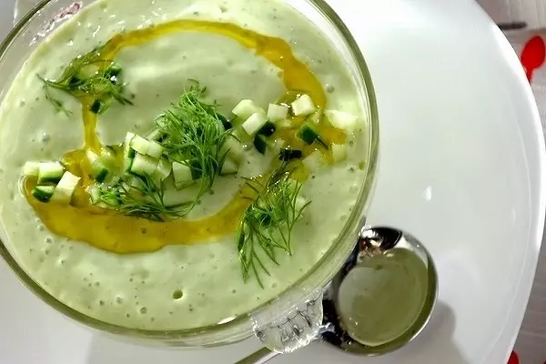 3、ガラスの器などに注ぎ、みじん切りにしたキュウリ、ディルを飾り、オリーブ油少々を垂らし完成。