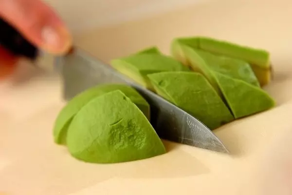 1、アボカドは皮と種を取り、ザク切りにする。<トッピング>のキュウリは粗みじん切りにしておく。