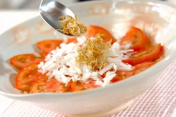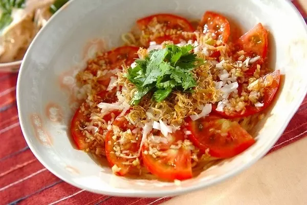 3、(2)の麺にトマト、玉ネギ、(1)のチリメンジャコ、香菜を盛り合わせ、<タレ>を注ぐ。