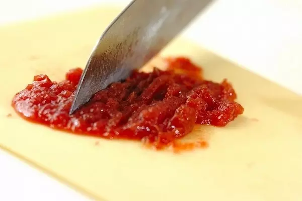 ・<おかか梅>の梅干しは種を取り、包丁でペースト状になるまでたたき、他の<おかか梅>の材料と混ぜ合わせる。