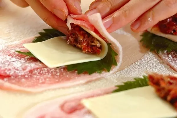 薄切りの豚肉に、かつお節と一緒に叩いた梅干と大葉、そしてスライスチーズを、クルクルとロール状に巻いていきます。巻くことで薄い豚肉もボーリューミーに大変身。