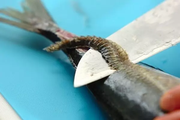 ・アジはウロコとエラを取り、盛り付けた時に裏になる側の腹に切り込みを入れてワタを出し、きれいに水洗いする。尾の付け根にあるゼイゴを削ぎ取り、身の厚い部分に切り込みを入れる。