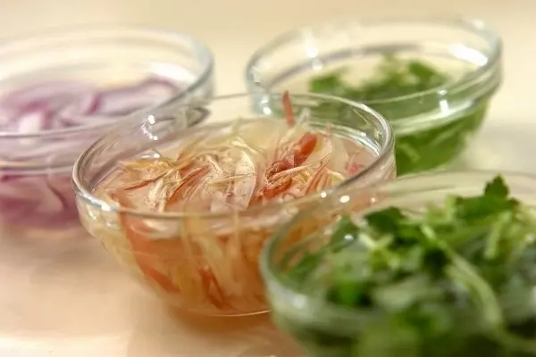 ・ミツバは根元を切り落とし長さ3cmに、紫玉ネギは薄切りに、ミョウガと大葉はせん切りにする。全て水に一度さらしてから水気をきる。