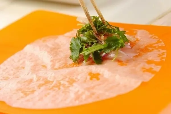 1、ライスペーパーを水で戻し、白身魚を2切れ並べ、下準備した野菜の1/5量をのせて巻く。