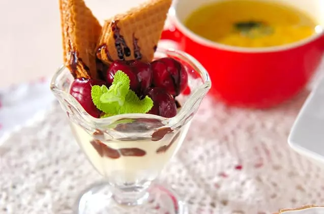 手順1:器にアメリカンチェリー、バニラアイス、ウエハースを盛り合わせ、チョコレートシロップをかけてミントの葉を添える