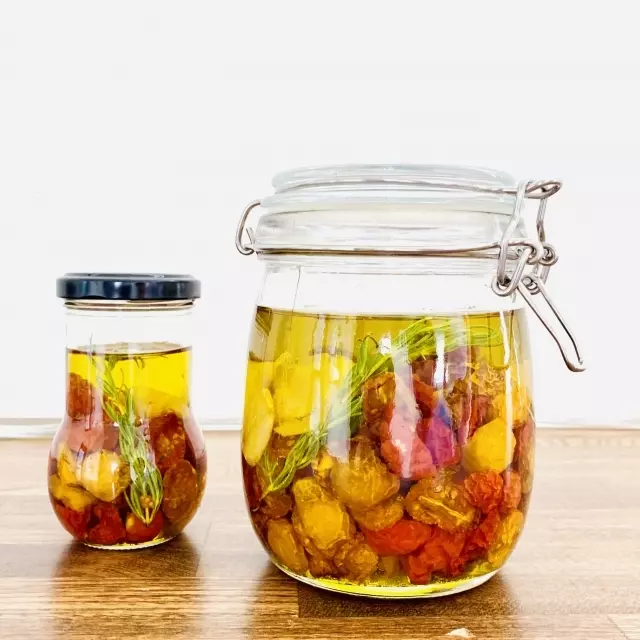 オリーブオイルを密封できる瓶に入れ、ドライトマトを入れると甘くて香り高い本格的なオイルになります。チーズや生野菜にかけるだけでお店のような一品になりますよ。あとはお醤油につけてみるのもおすすめ。トマトの甘みが加わったおいしいお醤油になるんです。こちらは冷奴や素麺にかけて食べるだけでいつもの料理がガラッと変わります。