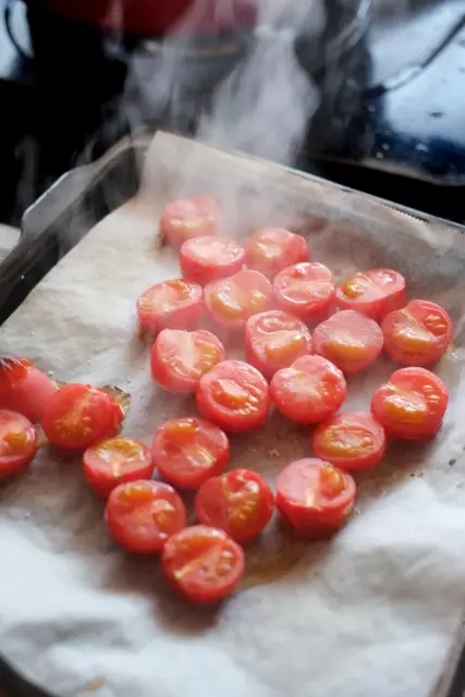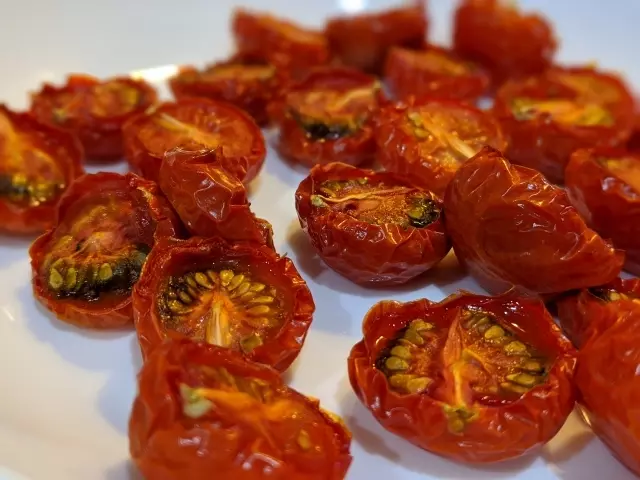 ミニトマトを半分に切り、クッキングシートを敷いた天板に並べて100度で90分ほど焼いて乾燥させます。ご自宅のレンジにより加熱具合が変わりますので、様子を見ながら焦らずゆっくり乾燥させましょう。家の中で乾燥させる分、天日干しよりは手がかからないかと思います。