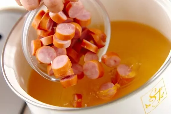 1、鍋に水と固形スープの素を入れて火にかけ、固形スープの素が溶けたらソーセージを加える。