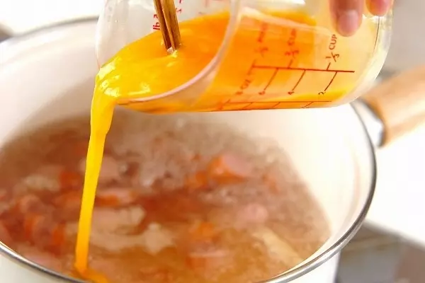 2、煮たったら<水溶き片栗>を加え、トロミがついたら溶き卵を加え、菜ばしで大きく円を描くように混ぜ合わせる。卵がふんわり浮かんできたら火を止める。