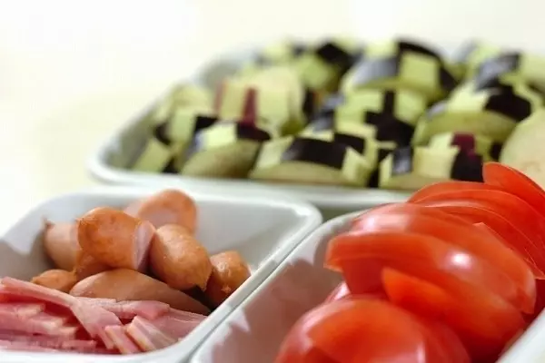 1、耐熱容器に、ナス、トマト、ベーコン、ソーセージ、ピザ用チーズを彩りよく並べ入れ、塩コショウをする。