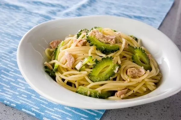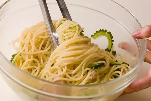 ゴーヤの独自の苦味はパスタと一緒に茹でることで和らぎます。