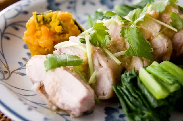 手順4:<合わせダレ>のショウガは皮をむいてみじん切りする。白ネギは縦に何本か切り込みを入れて小口からみじん切りにしする。他の材料、3の蒸し汁と混ぜ合わせる。器に小松菜を敷き、鶏肉を並べ、<合わせダレ>をかける。刻みミツバを散らし、カボチャを添える