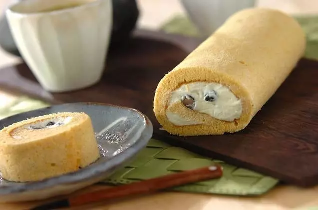 手順6:生クリームにきび砂糖を加えて8分立てにする。(5)にぬり広げ、黒豆を横1列に散らす。手前から巻いて、冷蔵庫で30分~1時間冷やす