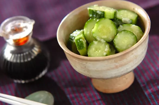 手順2:器にキュウリ、<調味料>の材料を入れ、全体を混ぜる。しょうゆをかけていただく