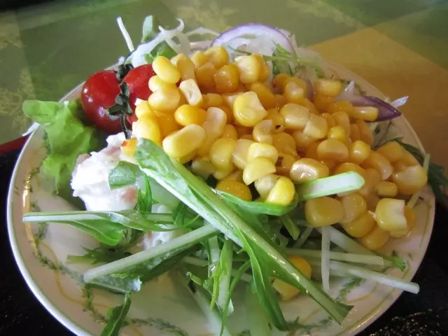 - レタス、きゅうり、トマトにとうもろこしをおいしく混ぜて器に盛り付けて完成です。