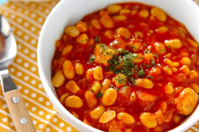 タンパク質と野菜がたっぷりとれる「大豆でチリコンカン」は、トマトジュースを使って、手軽に作りましょう。