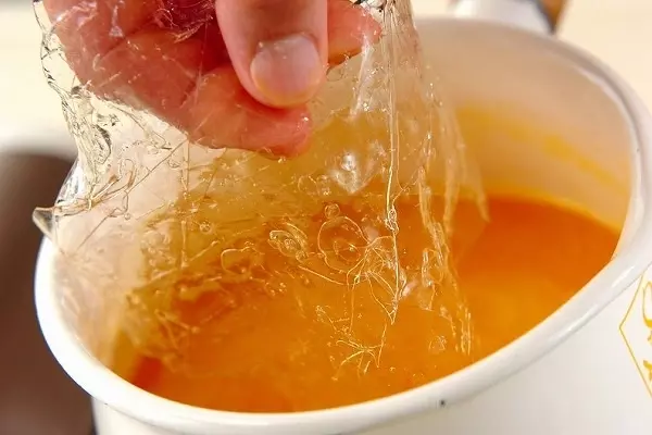 3、(2)を氷水にあてながら冷やし、トロミがついてきたら、(1)を加えて混ぜ合わせる。器に流し入れ、冷蔵庫で約1時間冷やしかためる。