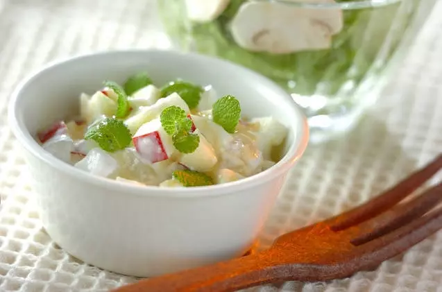 ナタデココはザルに上げ、汁気をきる。リンゴは皮と芯を取って1cm角に切り、分量外の塩水に放ってザルに上げる。