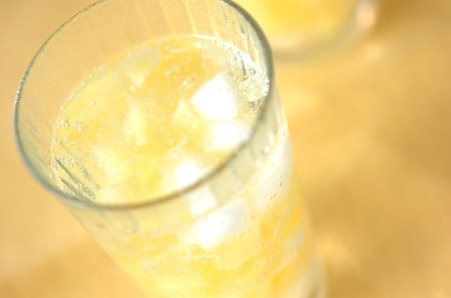 手順3:ナタデココが凍ったら、グラスにナタデココ、パイナップルを交互に入れて、炭酸飲料を注いで軽く混ぜる