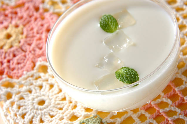 手順2:牛乳、アマレット、ナタデココを加えて混ぜ合わせ、鍋底を氷水にあてて少しトロミがついたら容器に流し入れ、冷蔵庫で冷やし固める。 固まったら飾り用に残しておいたナタデココをのせ、ミントの葉を飾る