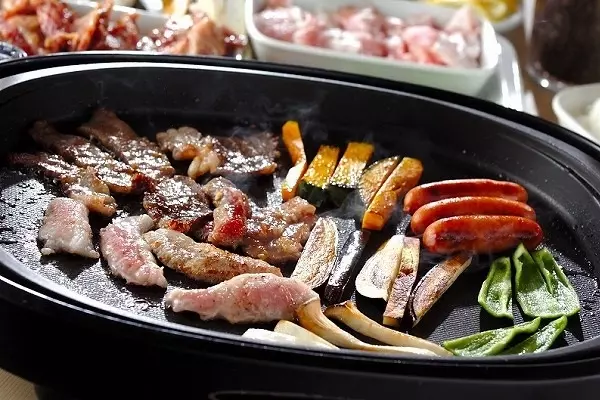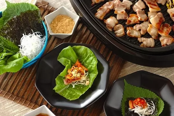 厚切りの豚バラ肉を焼いて、野菜で包んで頂く韓国料理のサムギョプサル。アルミカップにとろけるチーズを入れて、ホットプレートに乗せておいて、チーズを絡めて野菜で巻いても美味しいですよ!キムチも入れたりお好みで味変を楽しむことができます。