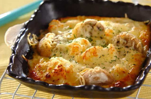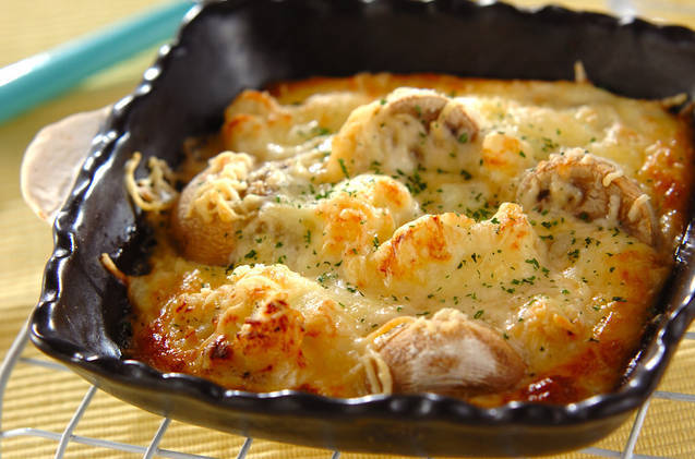 手順3:カリフラワーは汁気をきって耐熱容器に分け入れ、マッシュルームも並べる。<卵液>を流し入れ、ピザ用チーズをかける