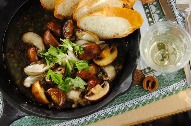 手順3:ブラウンマッシュルームに火が通ったら、カキを加え、5分ほど煮る。カキに火が通ったら、セロリの葉をちぎって散らす。バゲットを添える