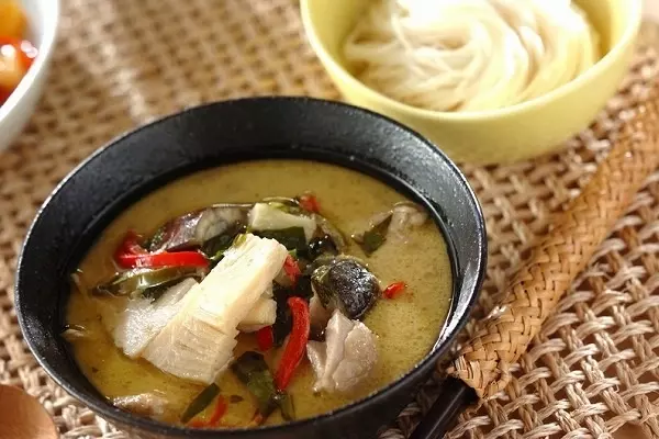 タイの人気料理、カノムチン・ナム・ヤー風の「素麺添えタイカレー」。本場タイでは、ココナッツが効いたタイカレーを麺にかけて混ぜながらいただきますが、つけ麺にすることで、麺に絡ませるカレーの量を自分で調節できるので、辛いものが苦手な方も美味しく頂くことができます。レシピではグリーンカレーですが、レッドやイエローカレーでも◎。