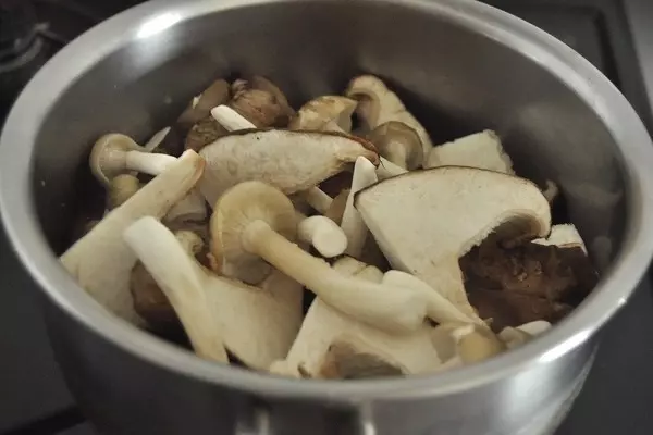 1、鍋にシメジ、シイタケ、だし汁、塩を入れて強火にかける。煮たったら弱火にし、鍋に蓋をして10分蒸し煮にし、火を止めてそのまま粗熱を取る。