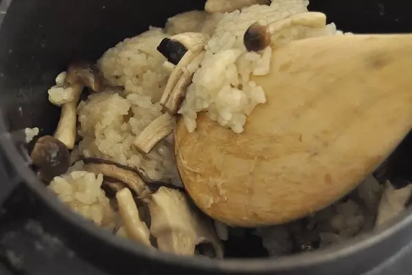 キノコに限らず水分が多い具は同様の調理法で炊くと水っぽくならず、失敗がありません。出汁と具の旨みがよく感じられるご飯に仕上がります。
