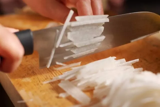 - 細切りにする向きは縦に切ると繊維が残り歯ごたえがよく、繊維を断つように横向きに切ると味がしみ込みやすくなります